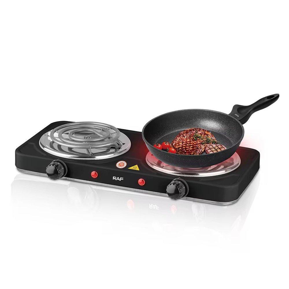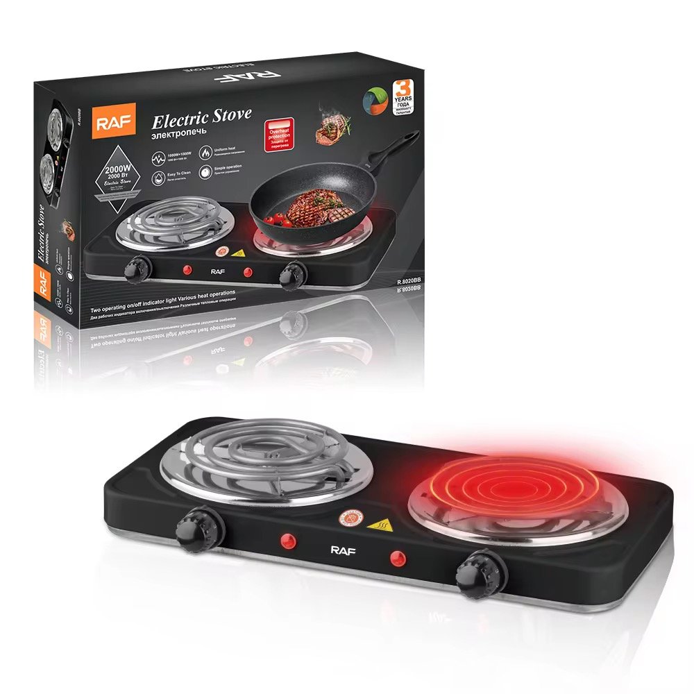 RAF Double Burner Electric Stove – Dual Hot Plate Coil & Infrared (Black)