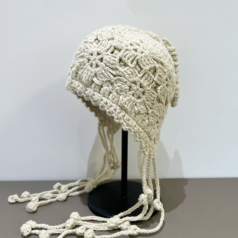 Handmade Crochet Beige Winter Hat – Boho Knitted Flower Design Cap with Tassels